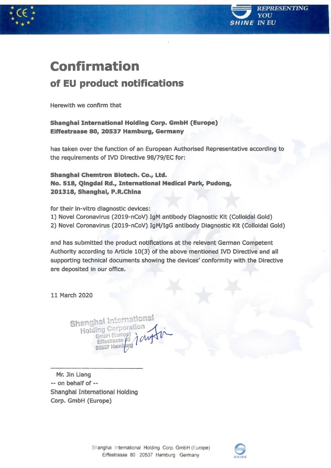 凱創生物新型冠狀病毒(2019-nCoV)IgM/IgG總抗體快速檢測試劑盒(膠體金法)、新型冠狀病毒(2019-nCoV)IgM抗體快速檢測試劑盒(膠體金法)獲得歐盟準入資格。